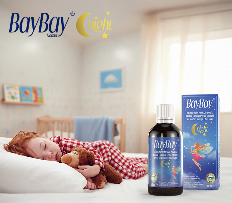 BayBay Night Damla, melisa, papatya, ıhlamur ekstreleri ve B6 vitamini içeren, çocuklar için özel olarak geliştirilmiş sıvı formda bitkisel bir takviye edici gıdadır. B6 vitamini yorgunluk ve bitkinliğin giderilmesine katkıda bulunurken sinir sisteminin normal işleyişine katkıda bulunur.