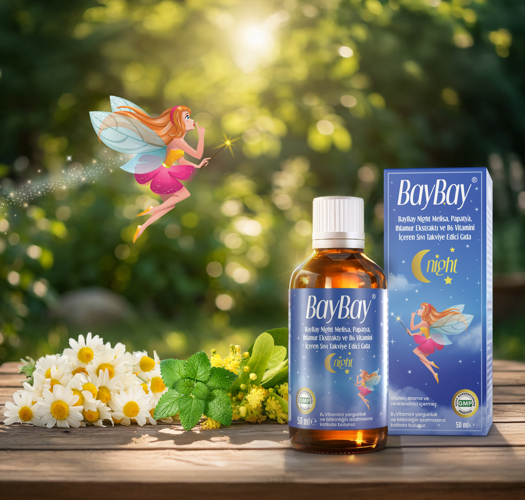 BayBay Night Damla, melisa, papatya, ıhlamur ekstreleri ve B6 vitamini içeren, çocuklar için özel olarak geliştirilmiş sıvı formda bitkisel bir takviye edici gıdadır. B6 vitamini yorgunluk ve bitkinliğin giderilmesine katkıda bulunurken sinir sisteminin normal işleyişine katkıda bulunur.